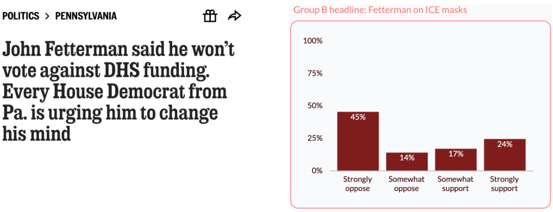 Respondents were shown several real headlines that documented Senator John Fetterman’s position on specific issues.