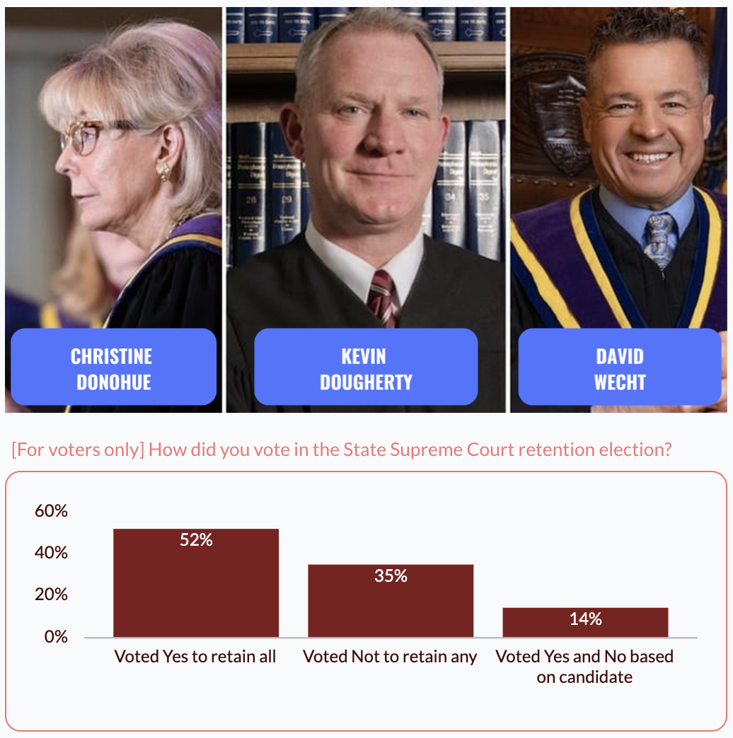 Our October poll showed that 58% of Kamala Harris voters and just 38% of Trump supporters said they were “Extremely Motivated to Vote”, which proved to be highly predictive of the ballot result. The Supreme Court retention vote was 61% Yes, 39% No.