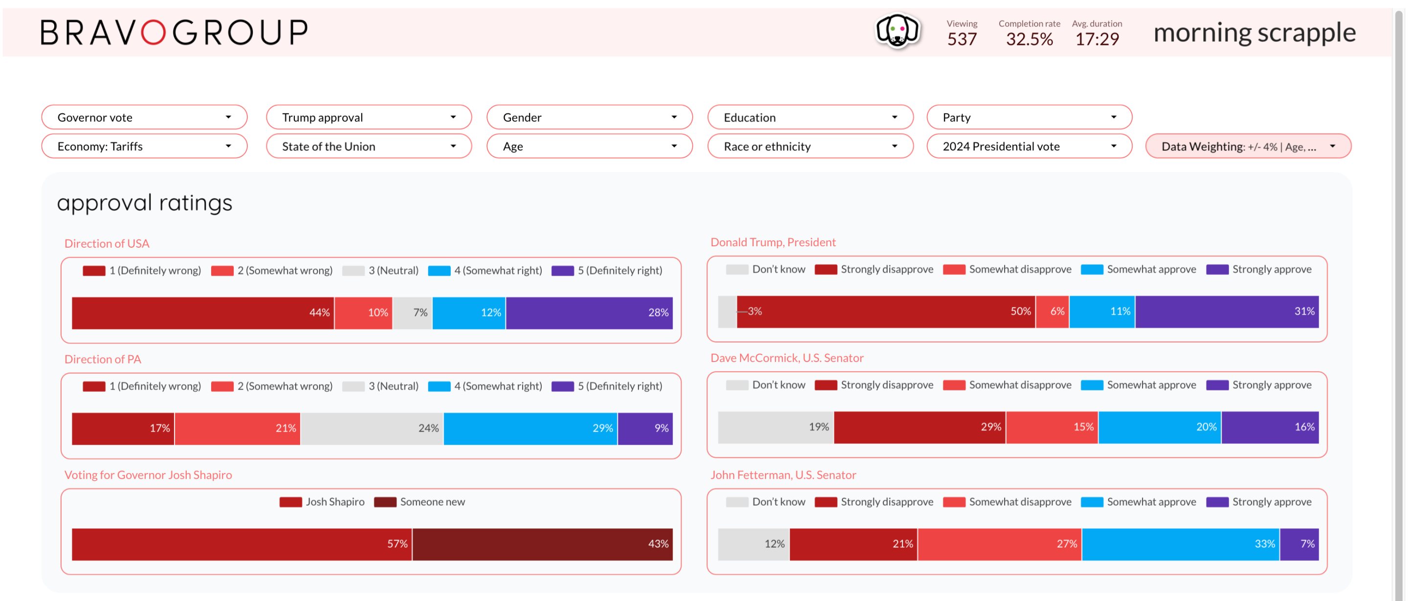 To explore our latest polling data, sign up to visit our Morning Scrapple dashboard, where you can interact with visualized results, filter by demographics and gain deeper insights into Pennsylvania’s shifting opinions.
