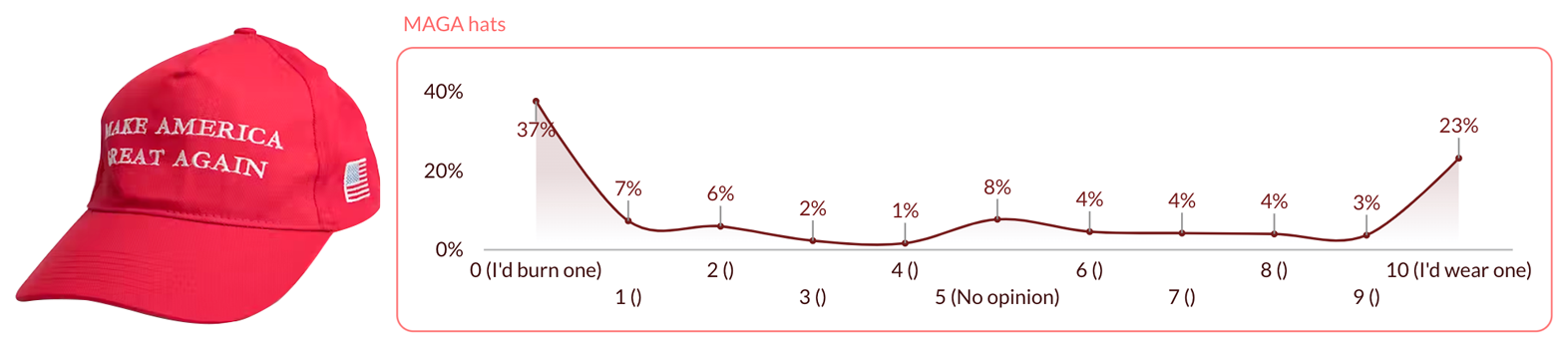 - Political identity shows up everywhere — even in fashion: Respondents were split down the middle when shown a MAGA hat, with some saying they’d proudly wear one and others saying they’d rather burn it. Polarization remains deeply personal.